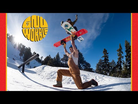 A special project between skate homies from Vermont. Forest grew up a talented skateboarder in Vermont and inevitably ran into the Mull brothers doing their Worble skate thing. Bailey brought his skateboarding to the snow and became one of the world’s best skate influenced snowboarders and an amazing artist. The Mull brothers built a Worble skate video empire with innovative committed skating, amazing Man Ramp good times and music. Worble has recently evolved from a video company into more than a skate brand and Forest has been doing art on a few Worble skates. Bailey and the crew decide it was time to bring the fun to the snow side of things and here we are Gnu X Worble.